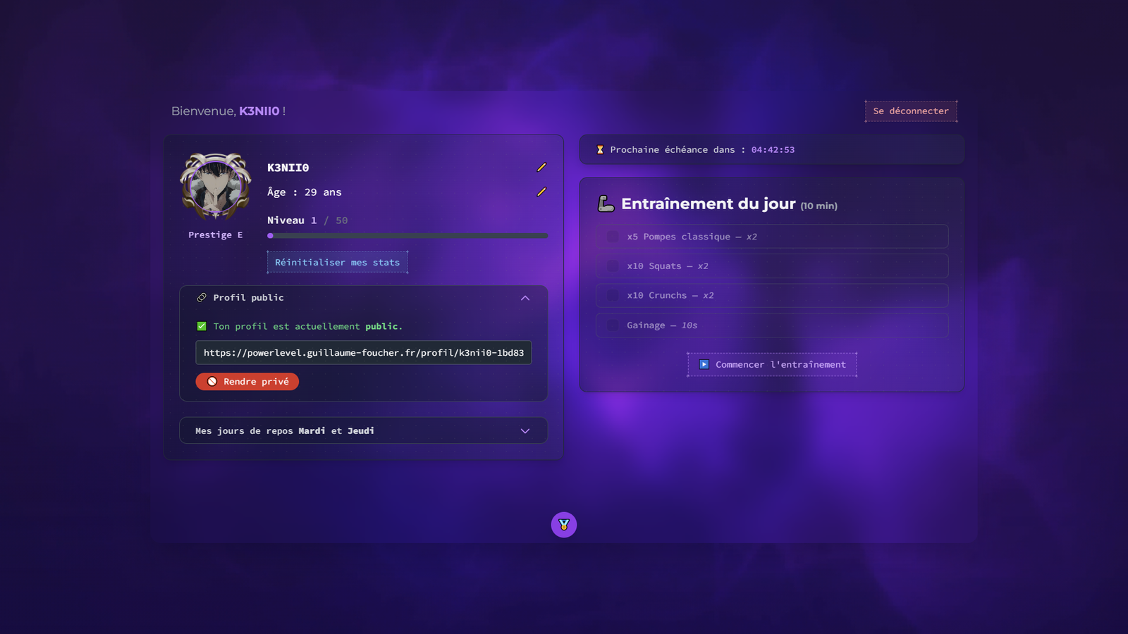 Développé en solo comme un challenge personnel, ce projet est construit avec l’aide de l’IA pour allier technologie et motivation. L’objectif : rendre l’entraînement accessible, motivant et fun, pour tous les niveaux.